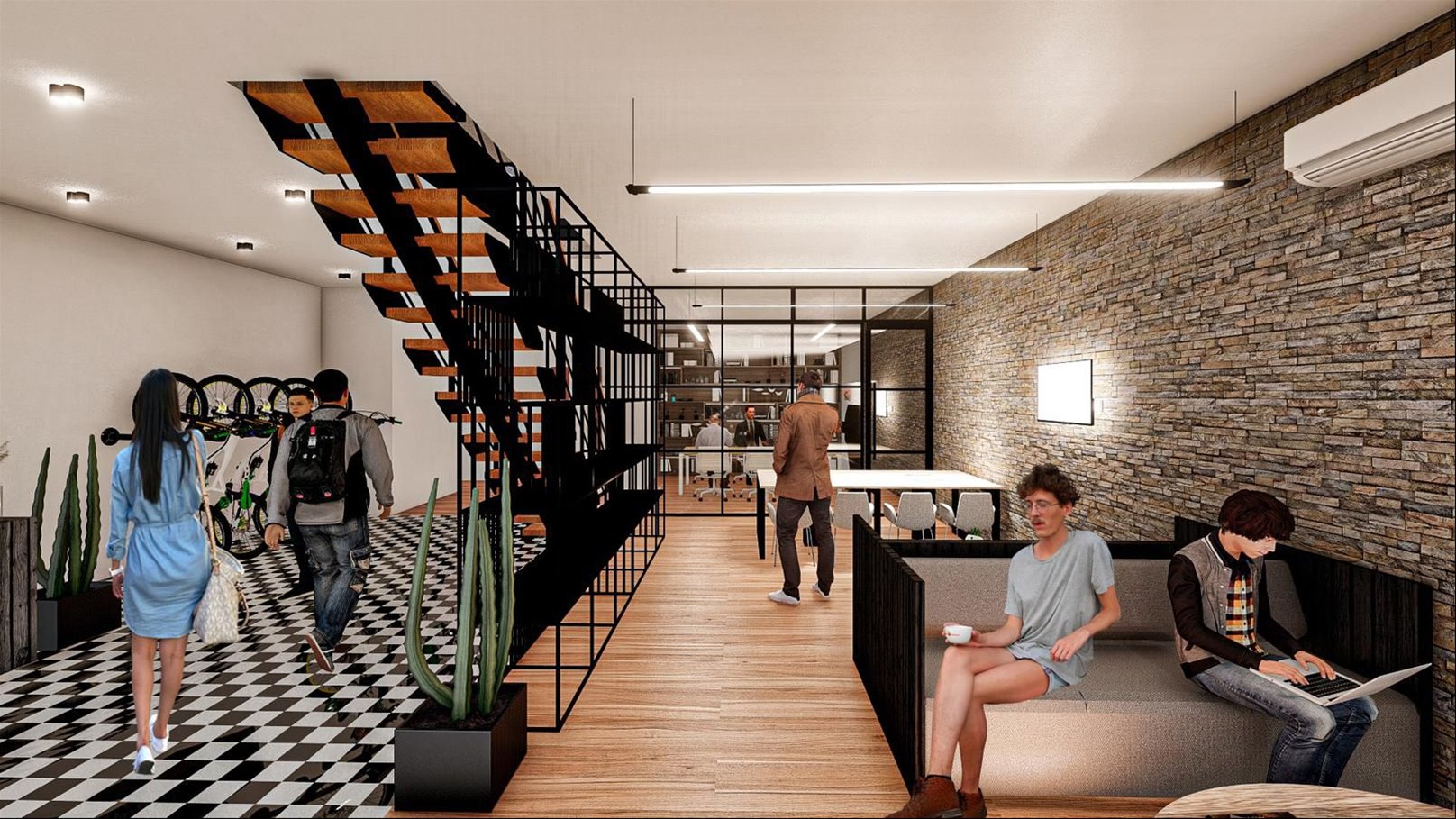 En planta baja se ubican la cafetería, el espacio co work, SSHH y el loundry.
