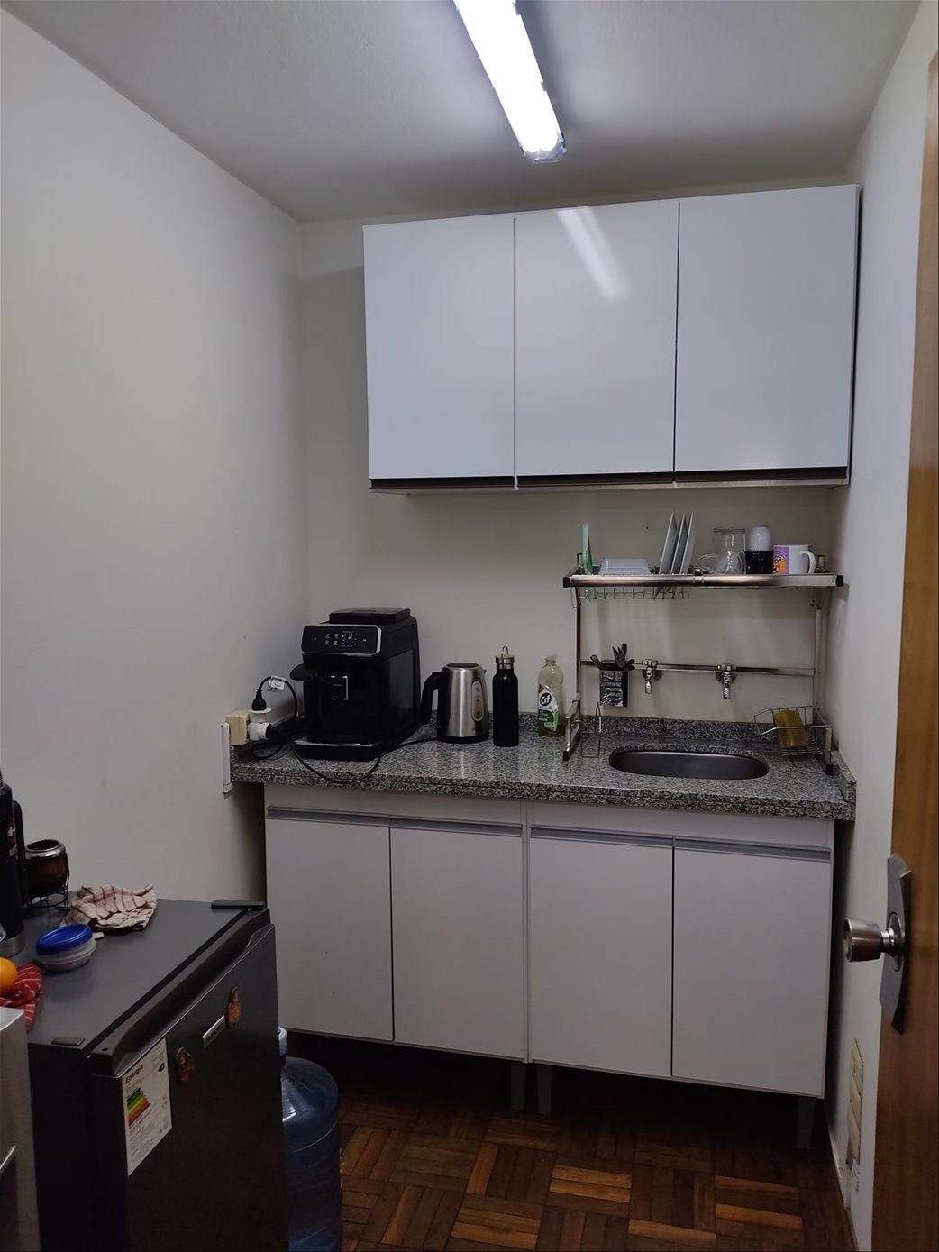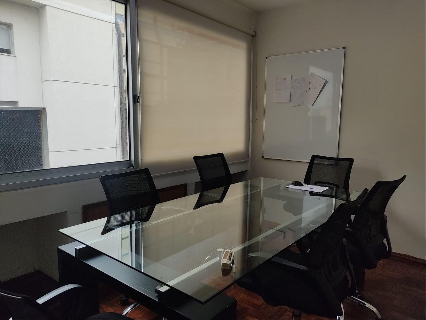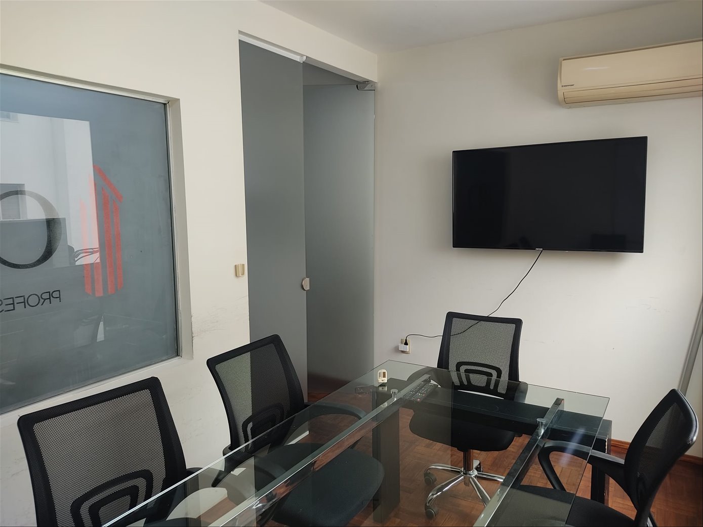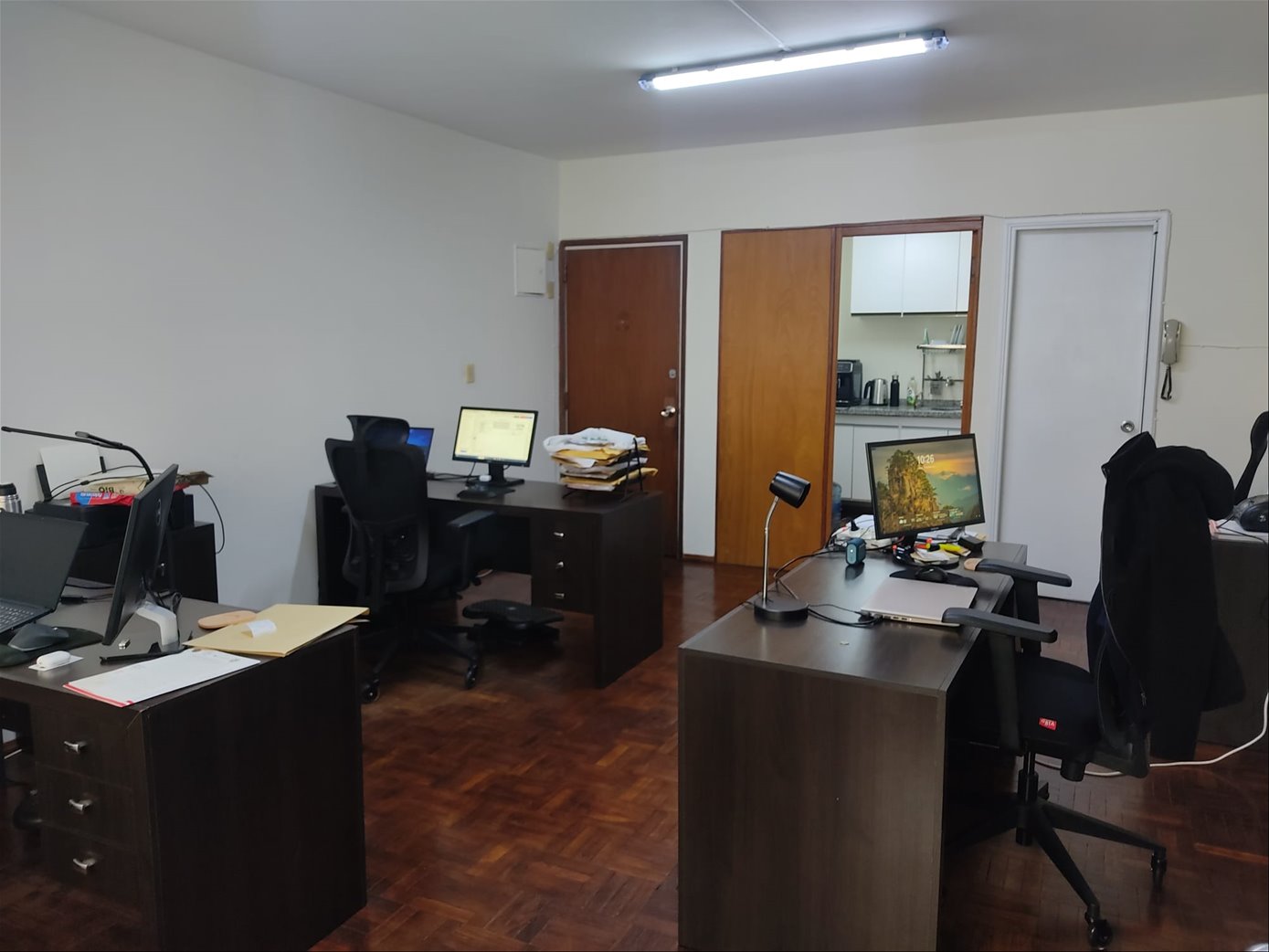La oficina cuenta con un ambiente principal, un espacio reservado para sala de reuniones, baño completo y una kichenette, ideal para pequeñas pausas o comidas rápidas. La calefacción se resuelve mediante aire acondicionado split, asegurando confort térmico en todas las épocas del año.