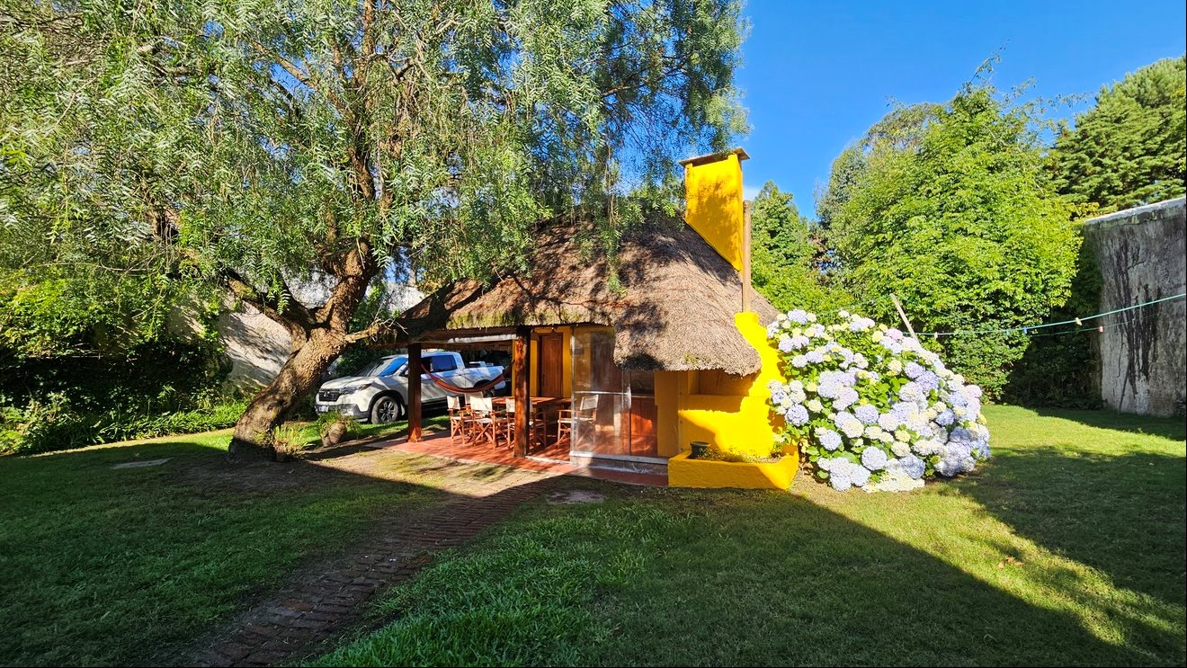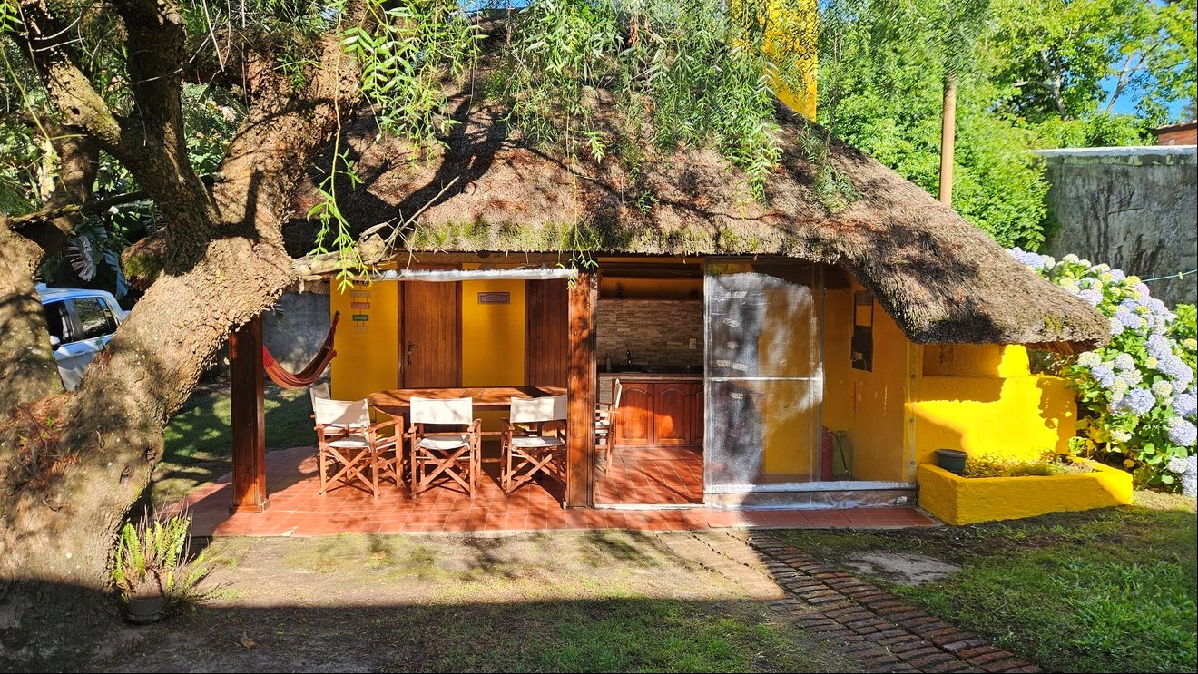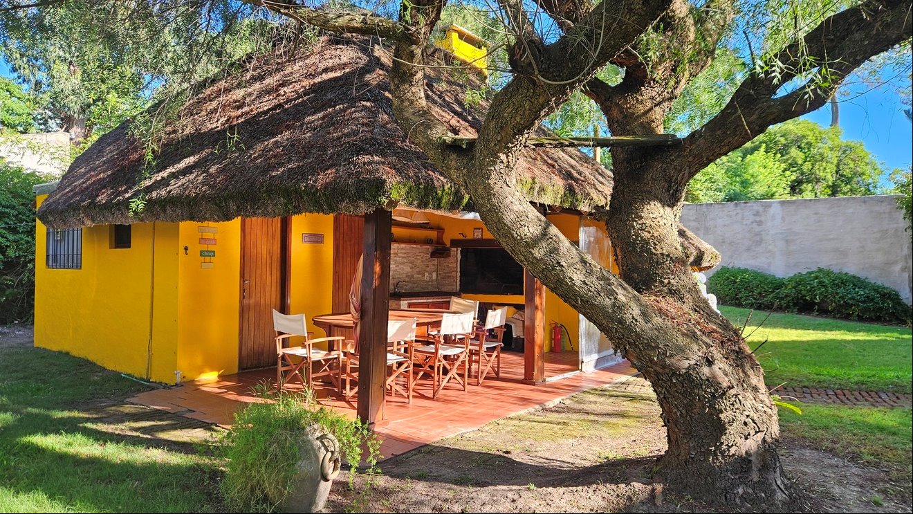 Jardín trasero con barbacoa techada, ideal para reuniones, además de un servicio completo con baño.