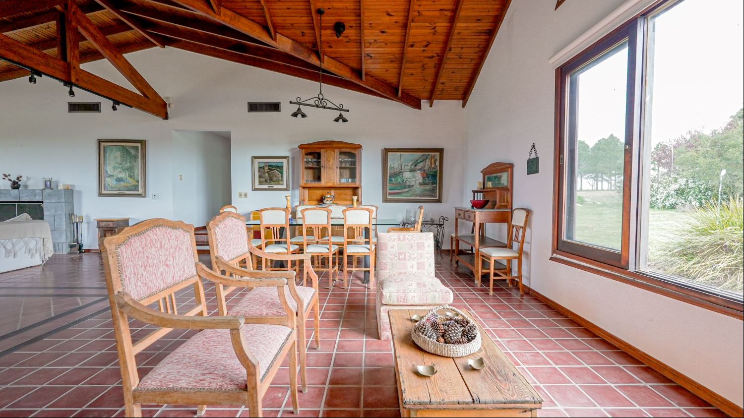 Al centro de la construcción se encuentra un importante living y comedor, con estufa a leña y con ventanales tanto al este como al oeste. Su generoso tamaño permite armar distintos sectores tanto para estar o como comedor. Totalmente rodeado de ventanales y con techo a doble altura, genera gran amplitud visual.