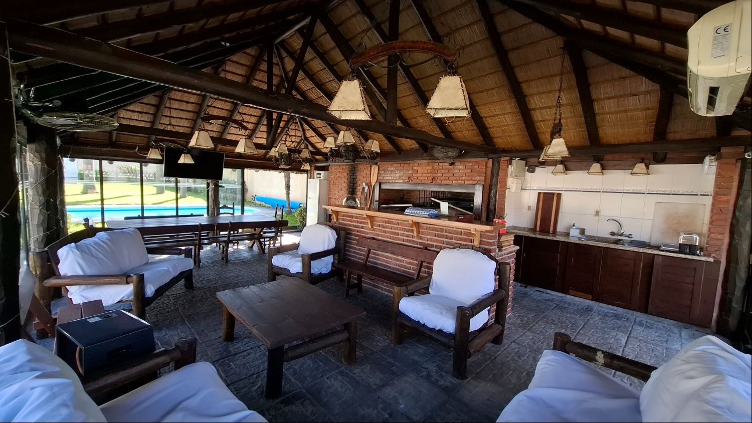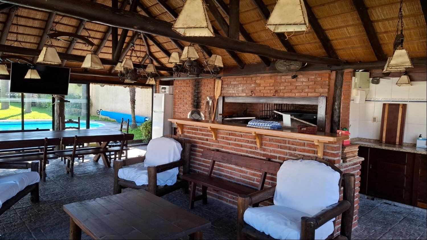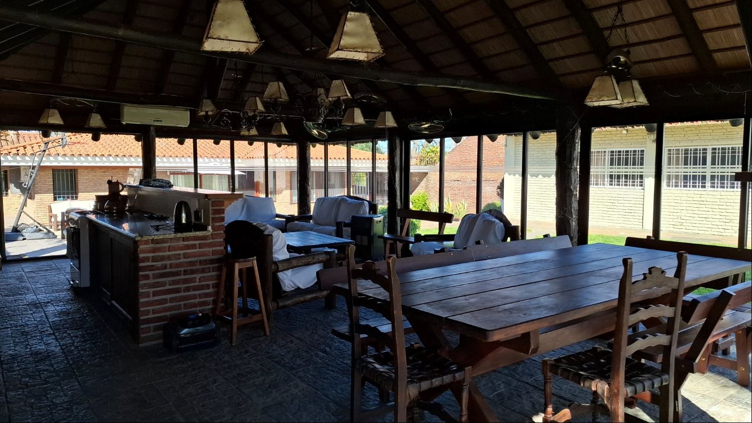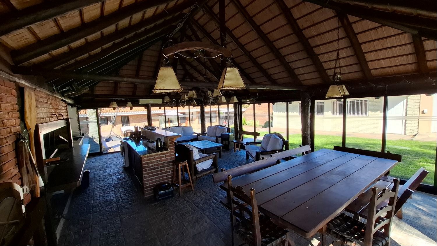 - Gran barbacoa cerrada, vidriada, con parrillero y horno de pizza