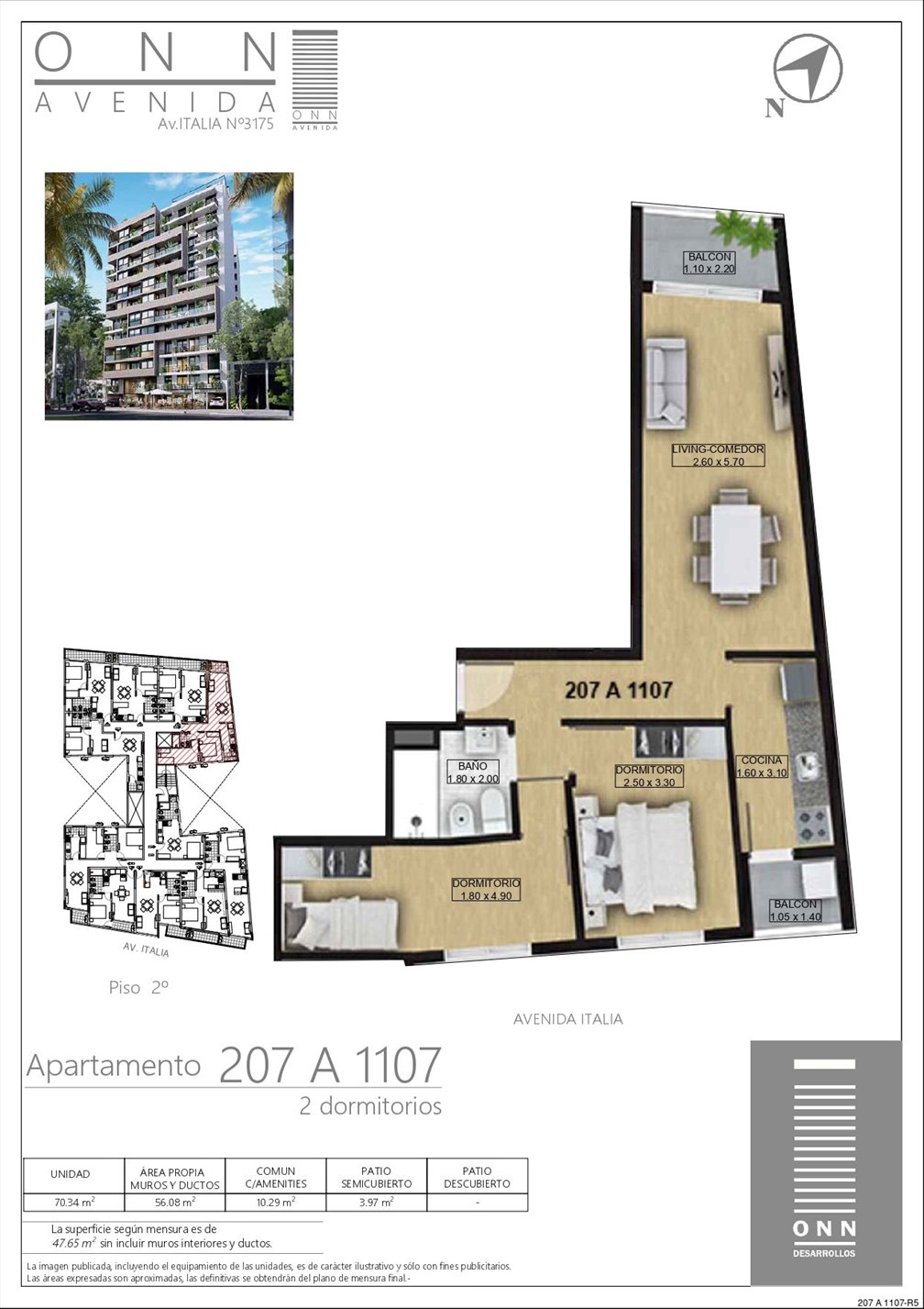Descubrí este moderno apartamento de 2 dormitorios en el exclusivo proyecto ONN Avenida, ubicado en Avenida Italia 3175. Situado en el 2º piso, al frente, este inmueble ofrece una superficie total de 70,34 m², incluyendo balcones privados, patio semicubierto y acceso a amenidades de primer nivel.