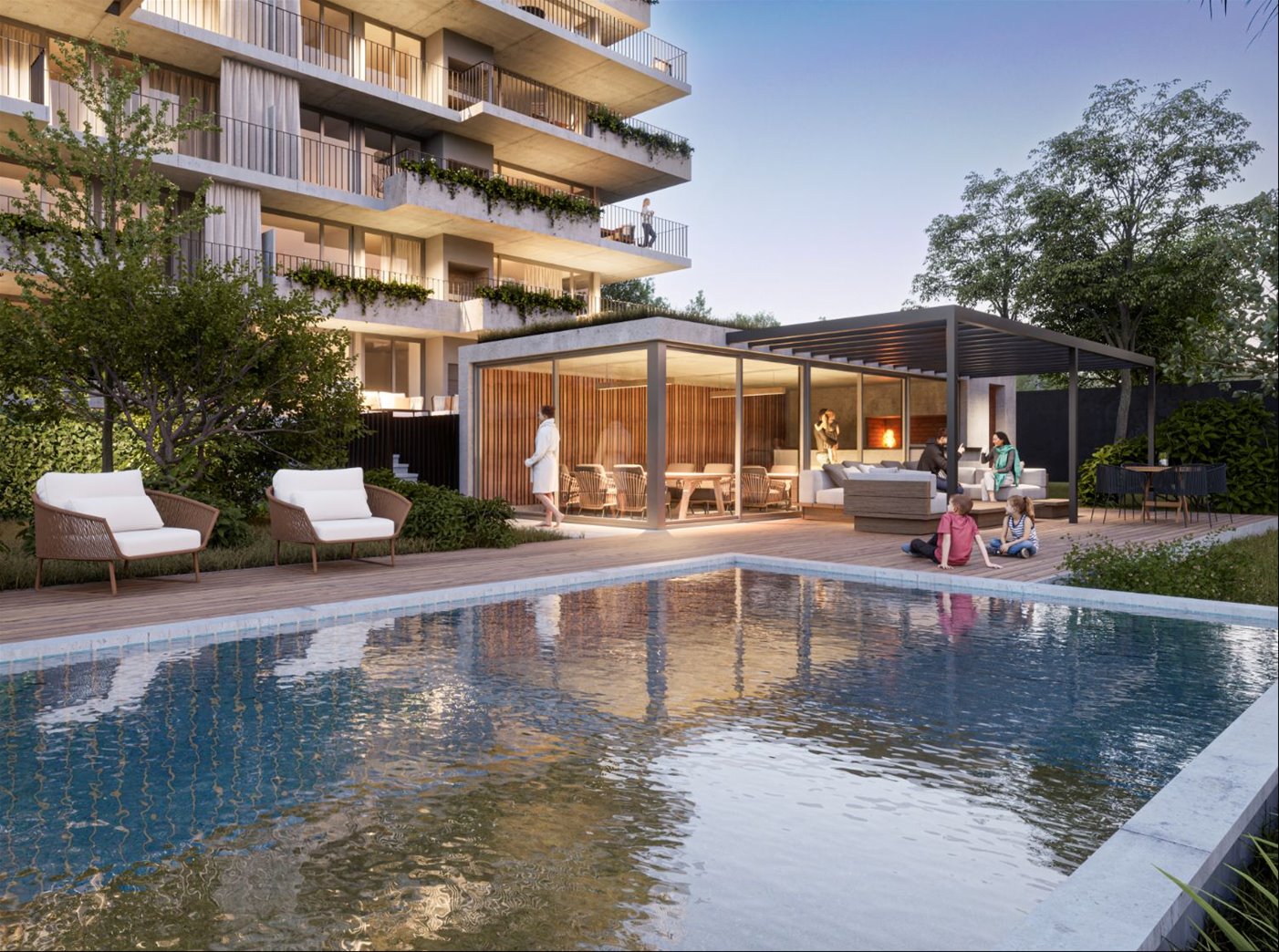 Barbacoa con living, piscina exterior climatizada, solárium, laundry, bicicletero,losa radiante, seguridad, accesibilidad, estación eléctrica.