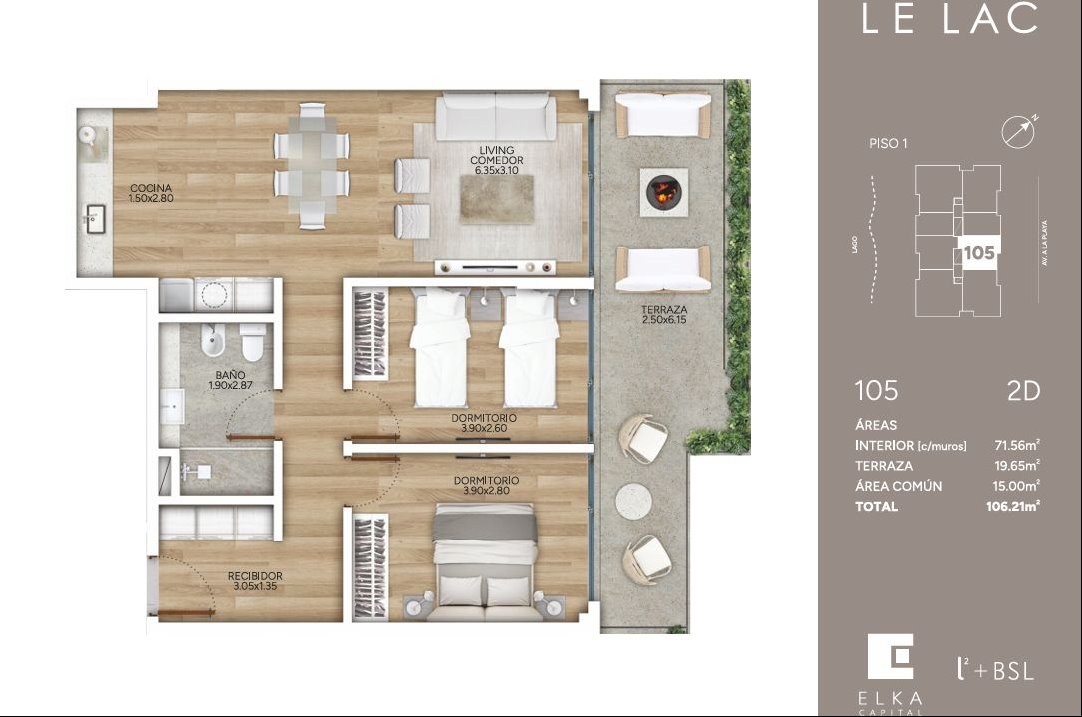 El área del apartamento es de 72 metros cuadrados mas una terraza de 20 metros cuadrados.