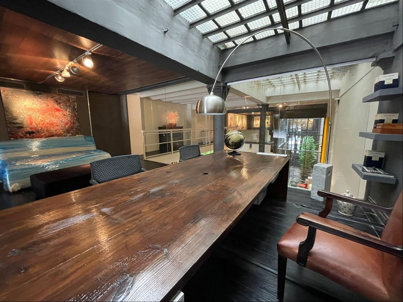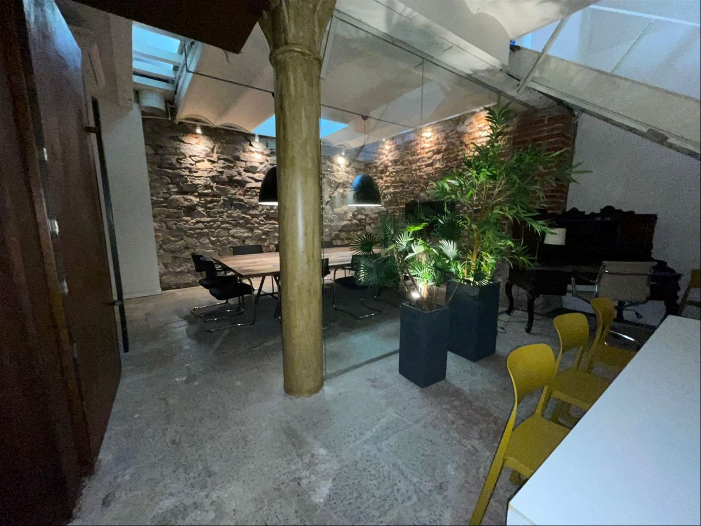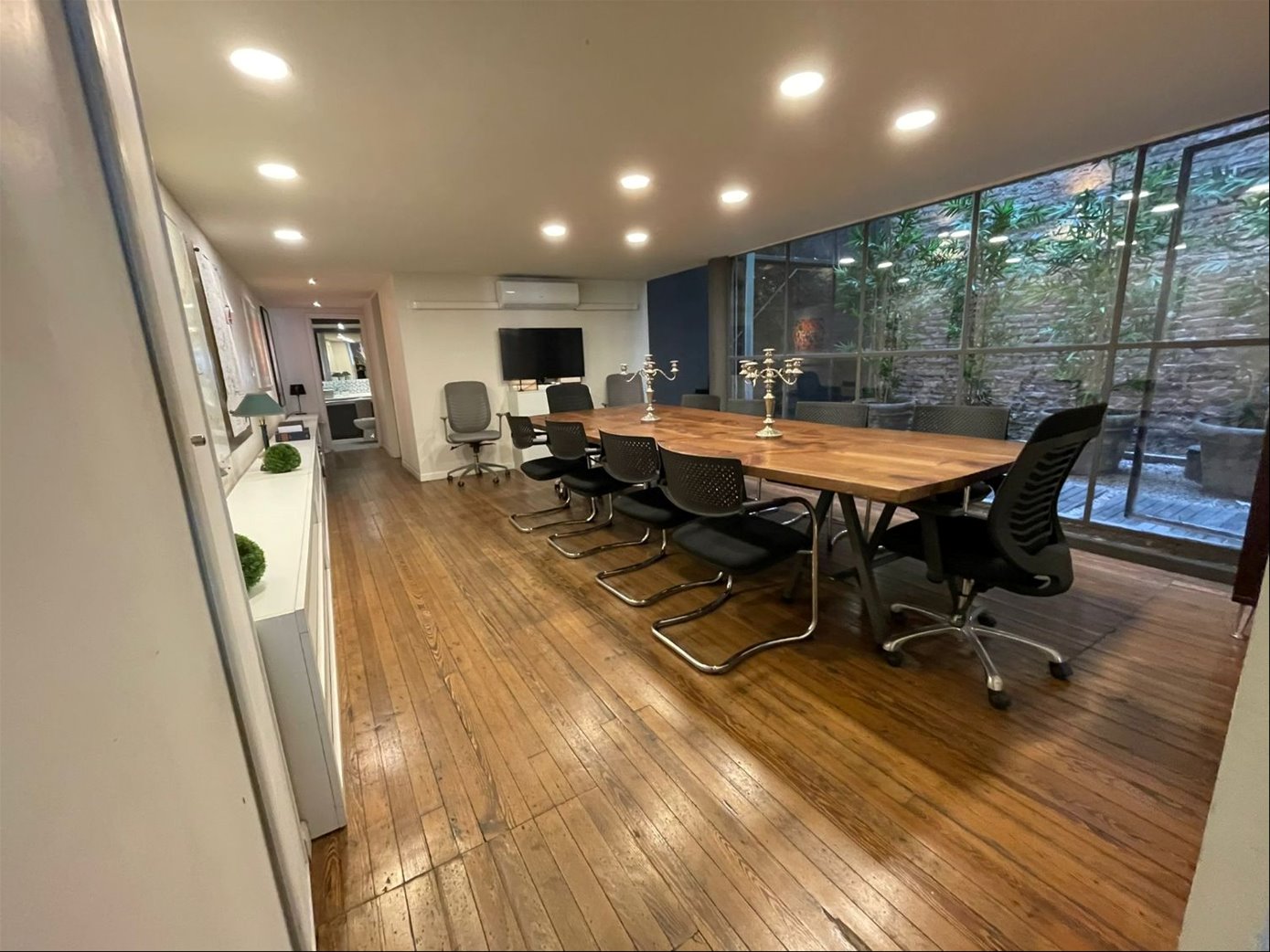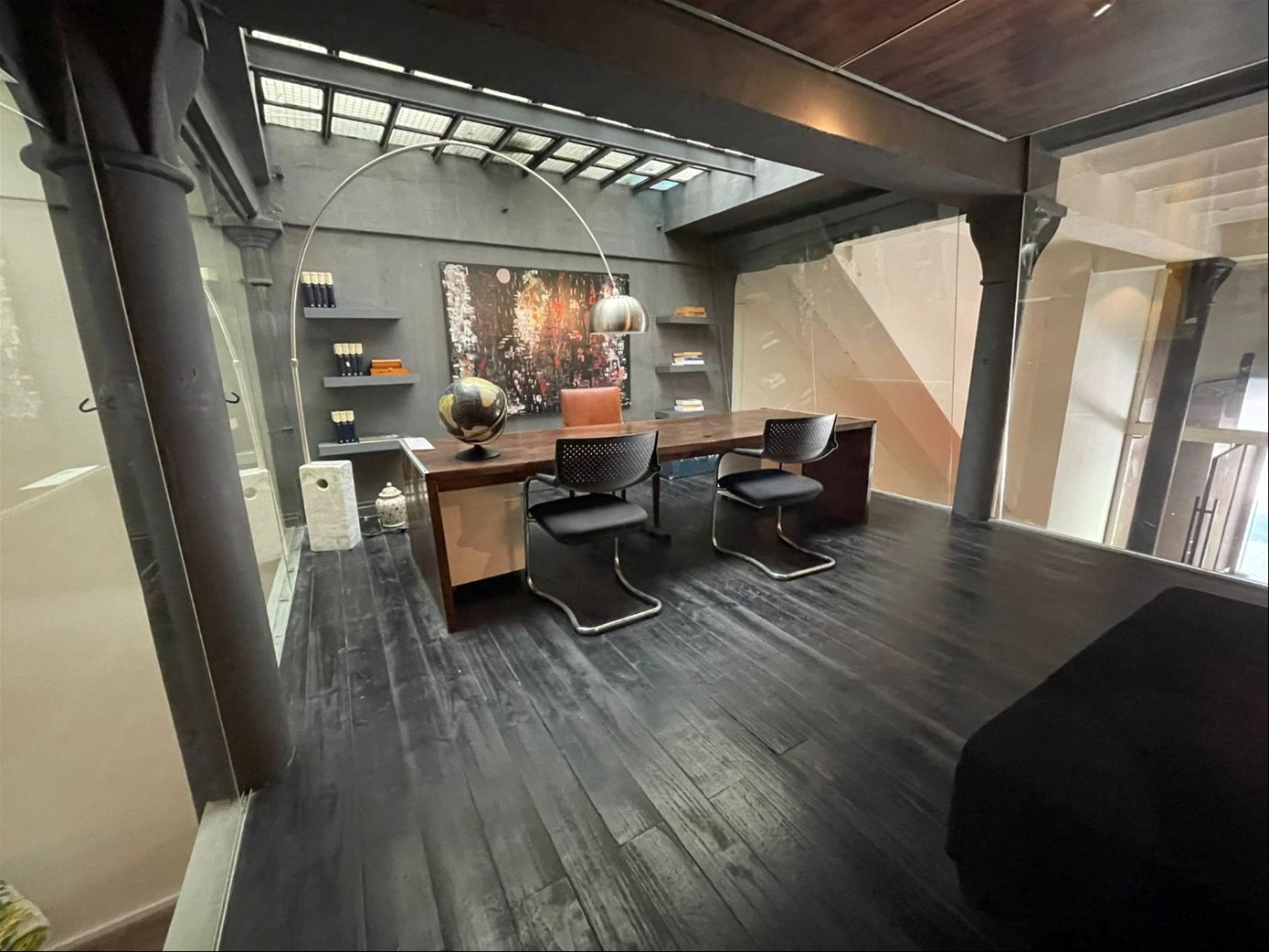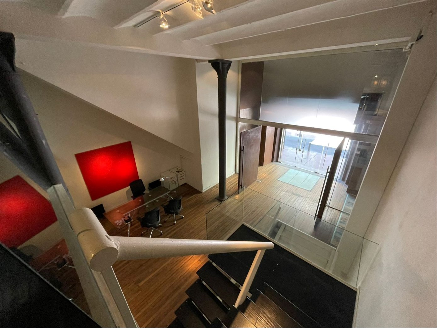 Una oficina con acceso a una de las calles mas emblemáticas de Ciudad Vieja, con puerta en cristal y una gran puerta principal en hierro añejado.
